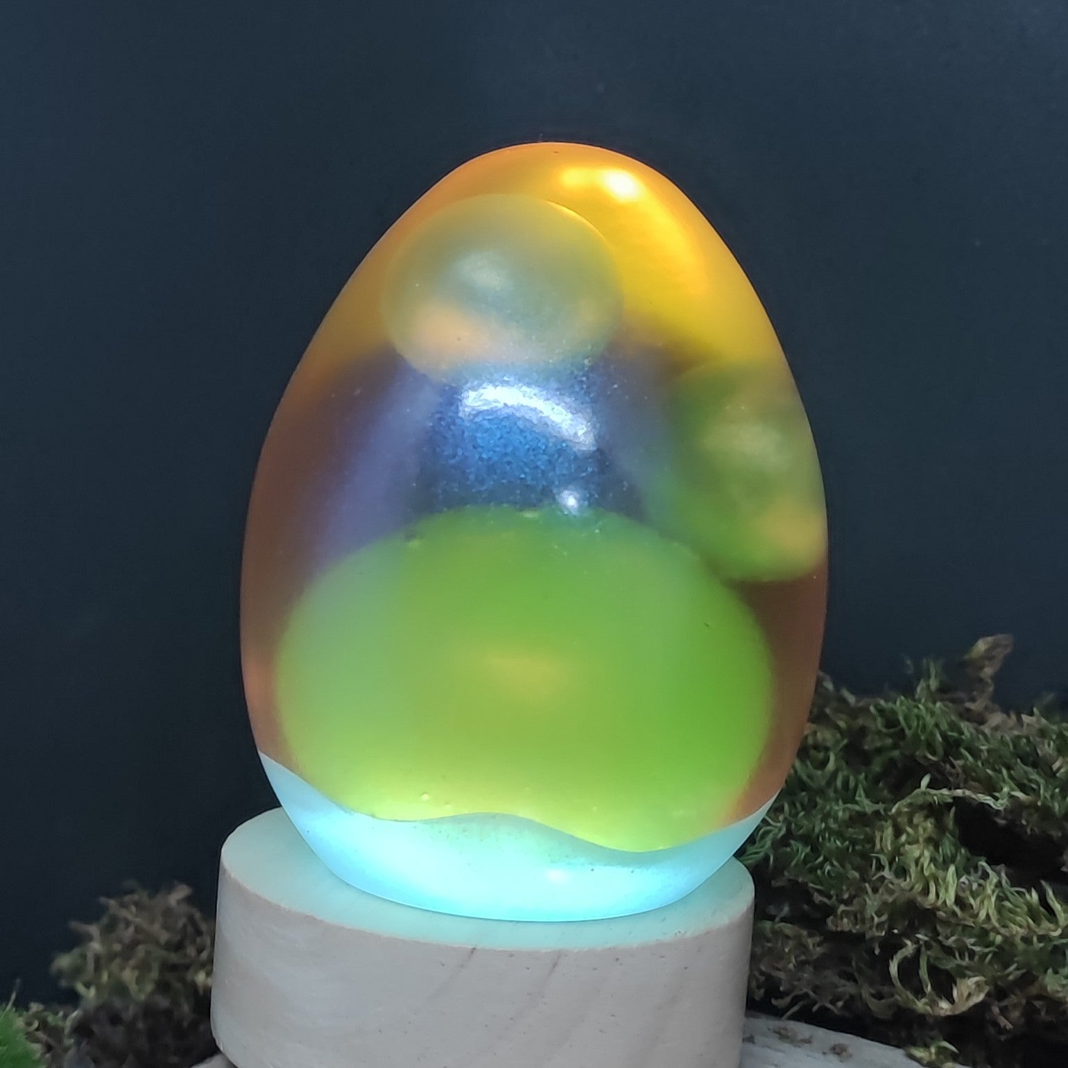 Il à pour base une grosse boule verte de 35mm et 2 bleues de 15mm, résine orangé de base puis vernis de ma création rouge avec reflet bleuté. Couleur des socle directement dispo sur chaque variante sélectionnable.