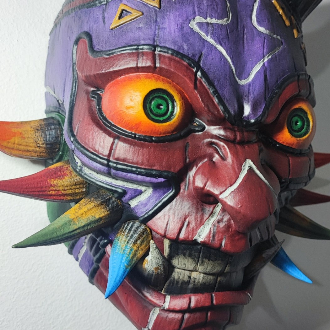 Ce Masque de Majora, inspiré de l’univers Zelda, est revisité dans une esthétique japonaise de type Oni, pour un rendu à la fois puissant et symbolique, qui ravira les fans de la licence.